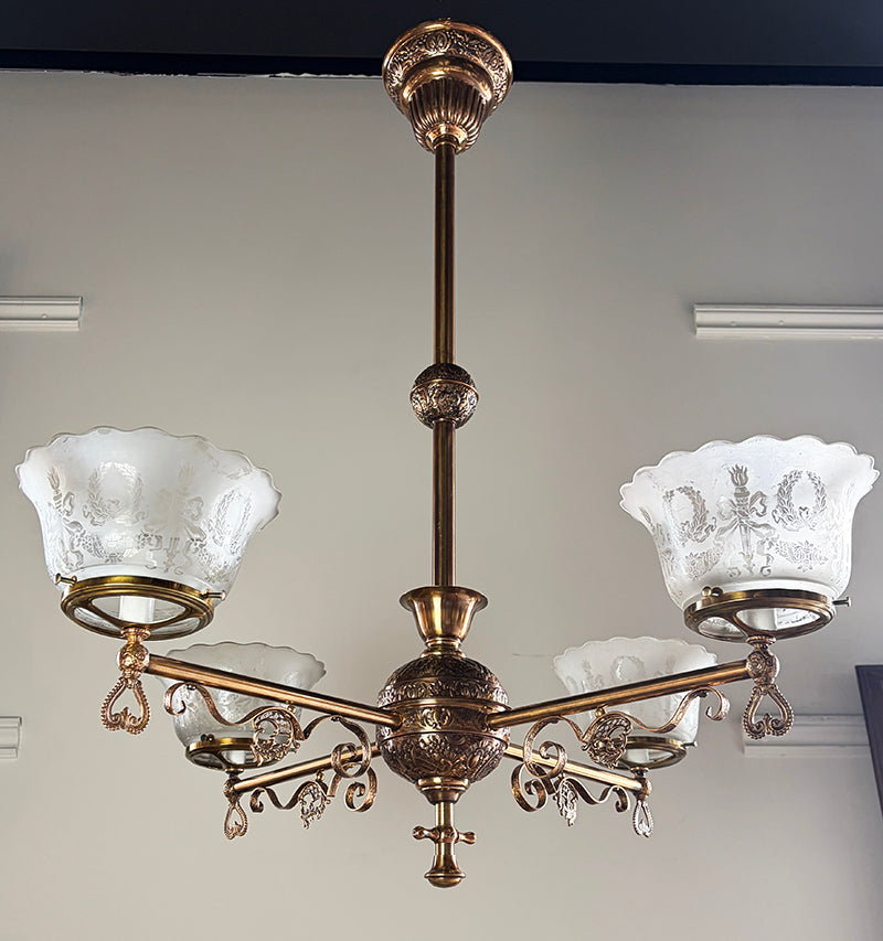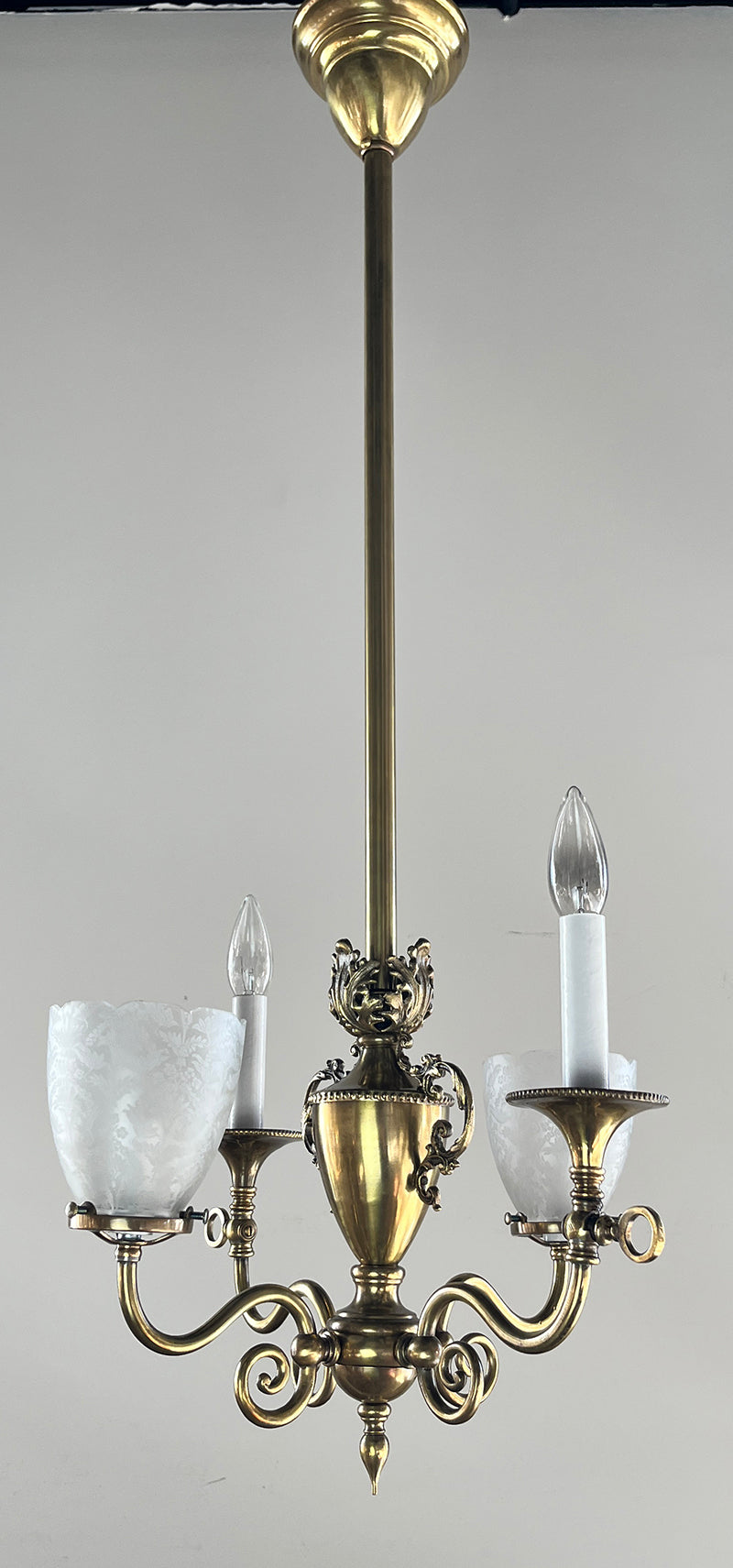 Very handsome 1895-1900 Edwardian combination gas electric four light with urn center body and cast...