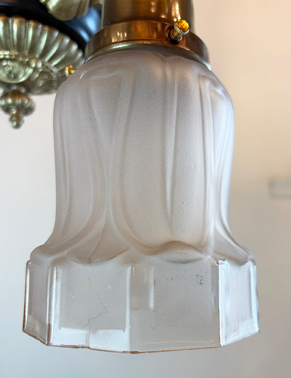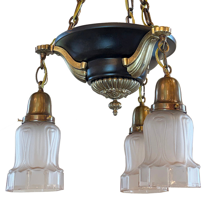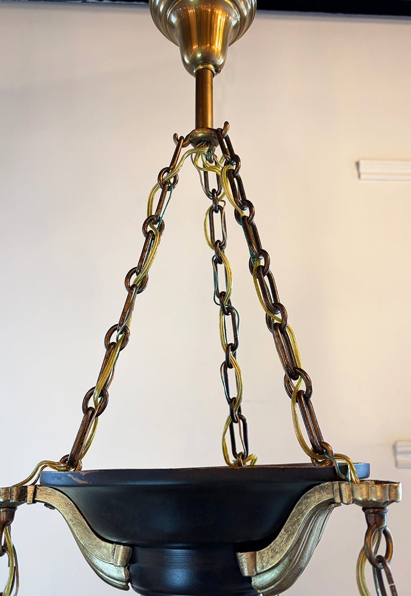 Elegant 1910-15 era Empire style three light pan with original frosted six sided shades. Perfect...