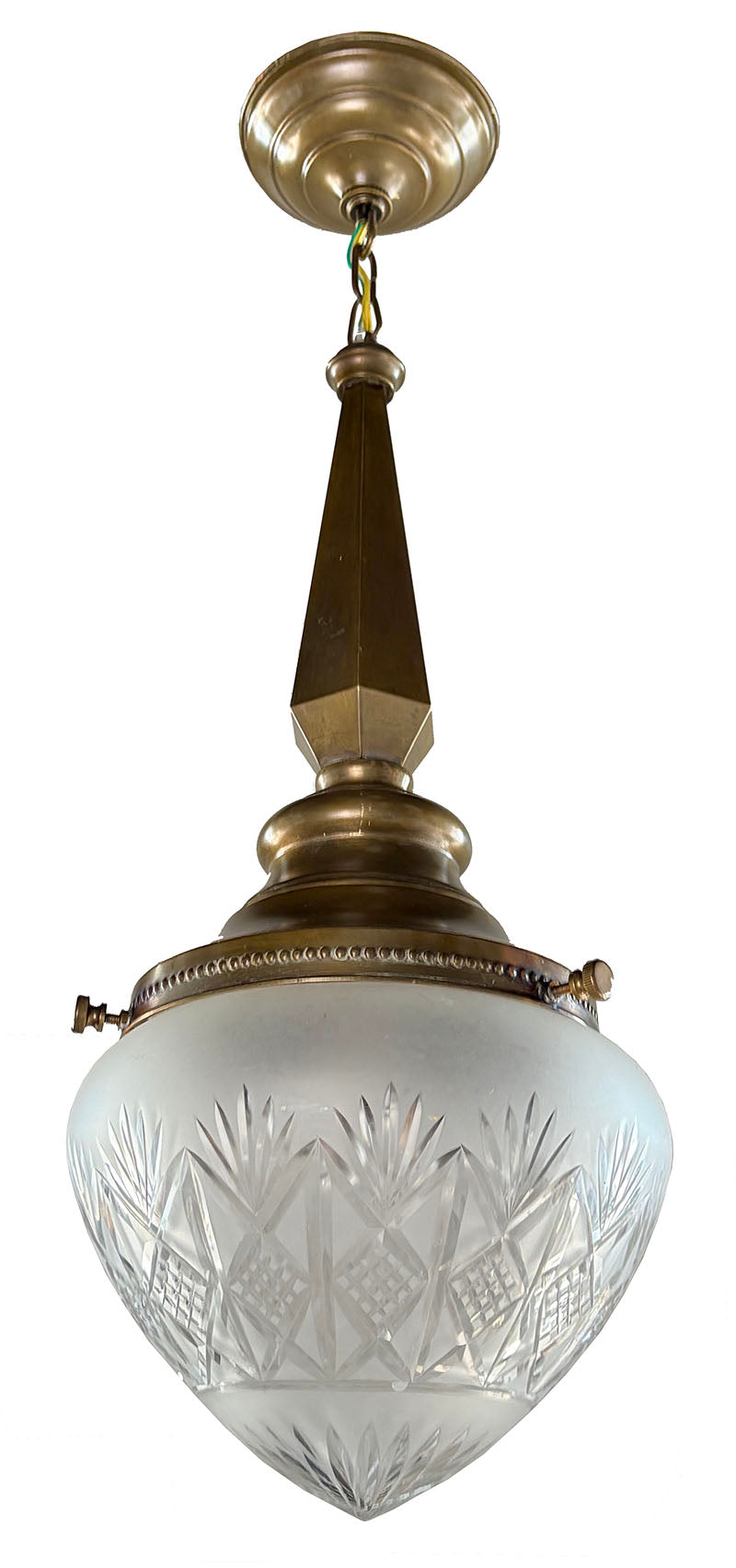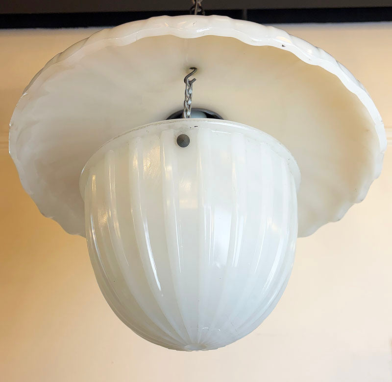 Great classic Art Deco pendant light with original patterned opal glass shade and pressed glass...