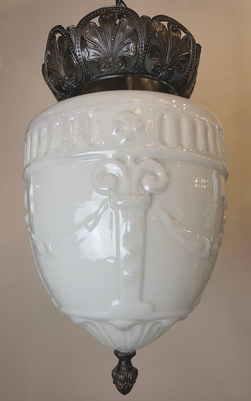 Great character and size on this 1910 era Edwardian pendant. Shade features a detailed garland...