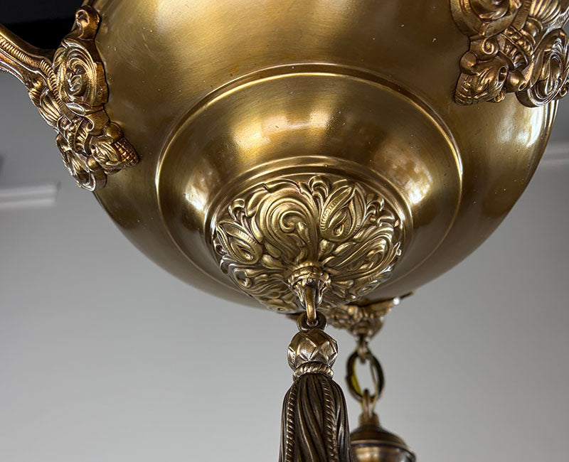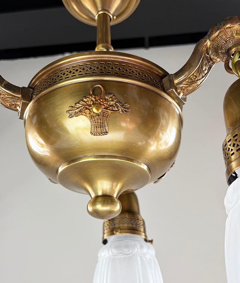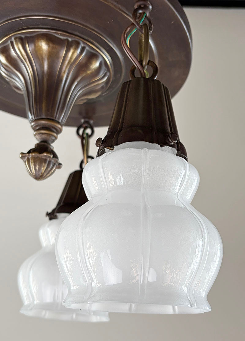 Classic Edwardian three light Sheffield flush mount. Nice embossed center body and original shades holders....