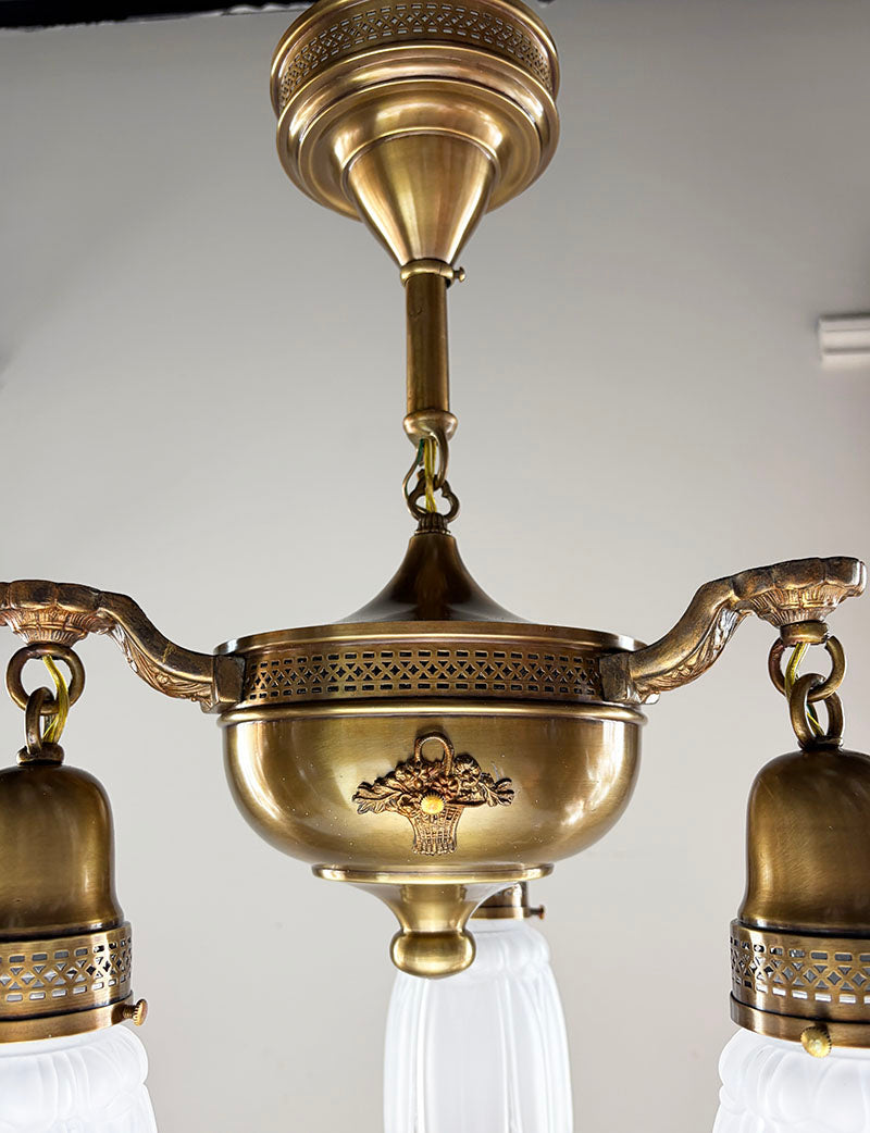 Handsome 1920s Tudor and Art Deco combination five light pan fixture with restored bronze and...