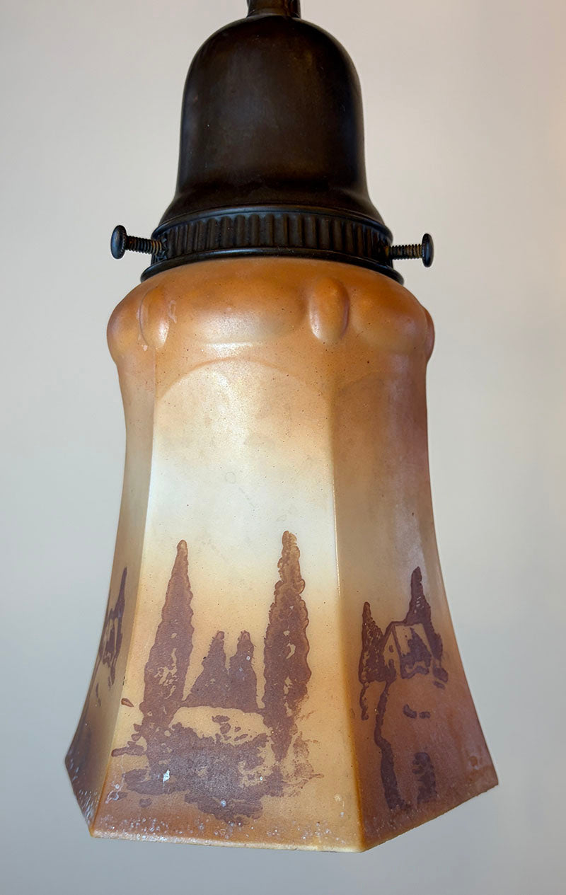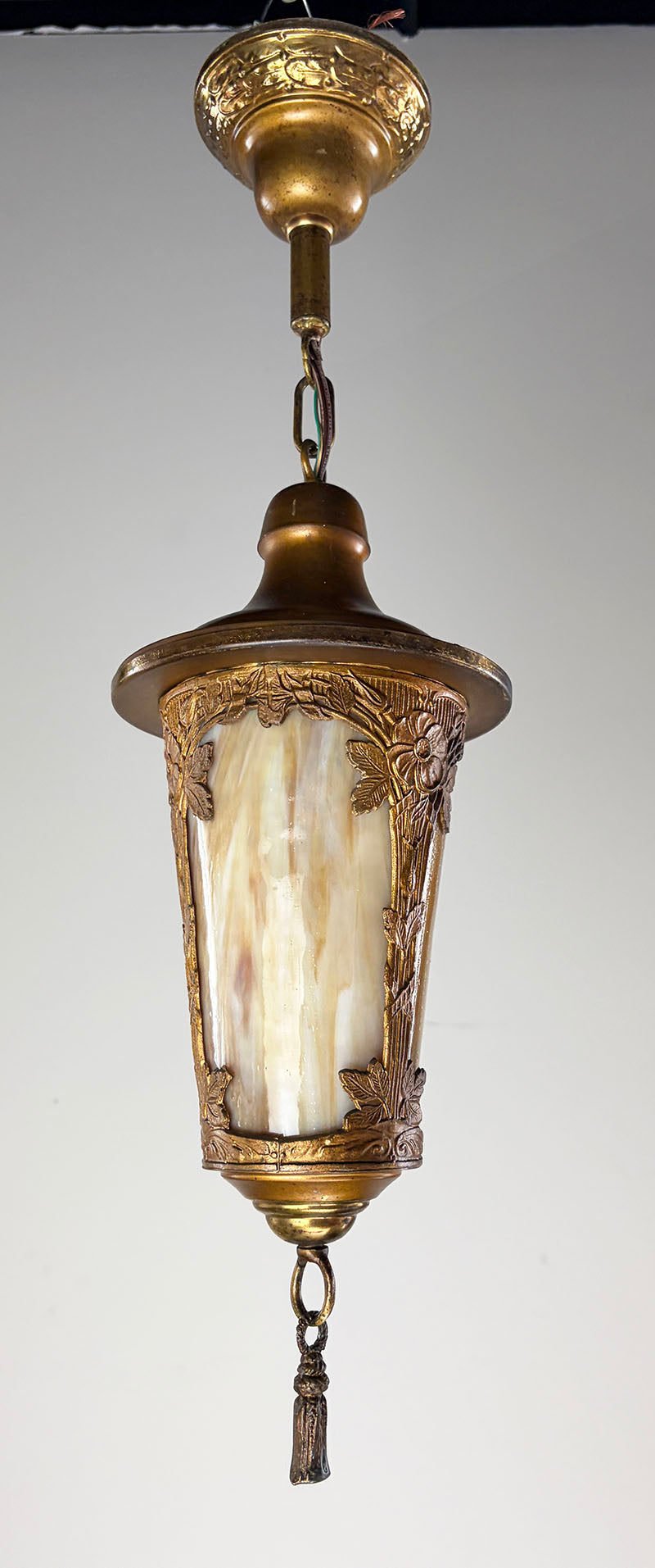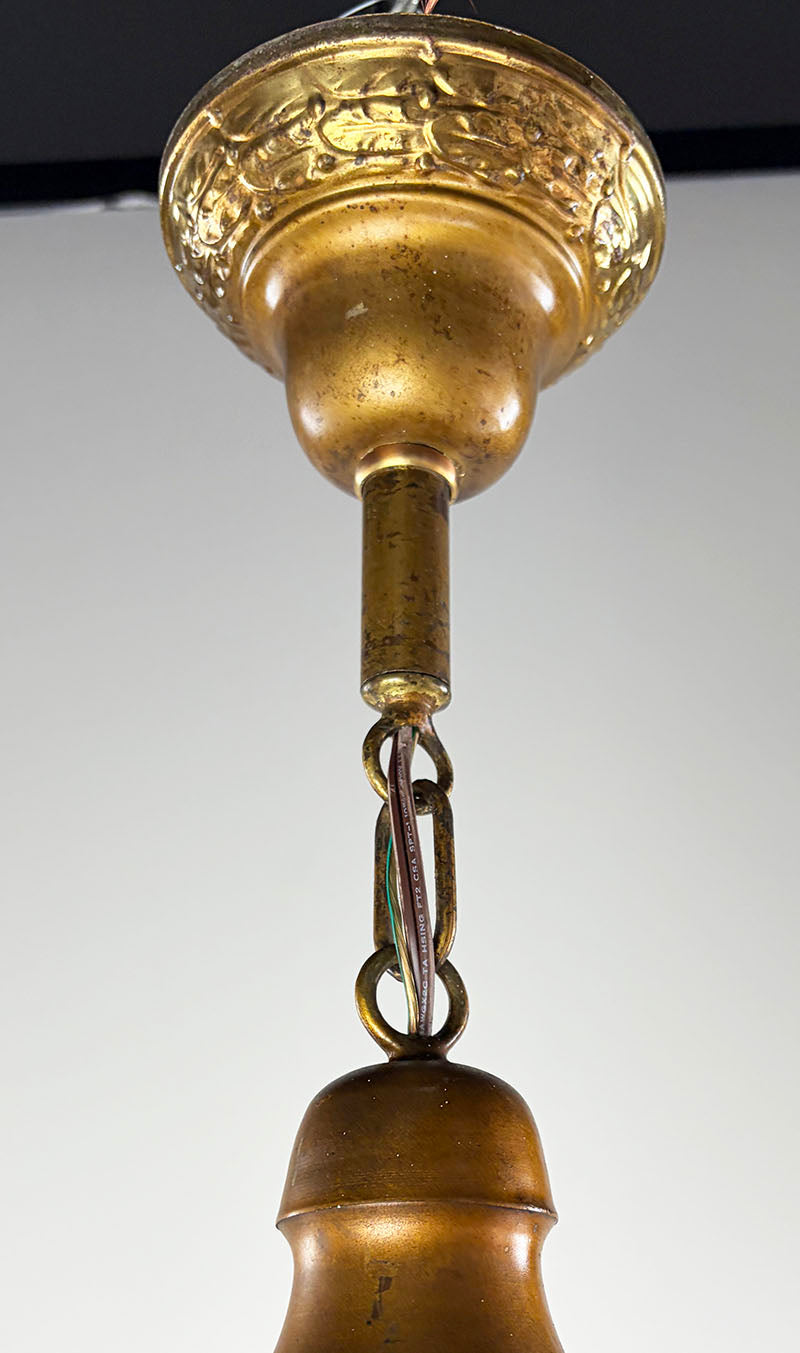 Nice rich verdegris patina on this aged brass Arts and Crafts lantern. Features original butterscotch...