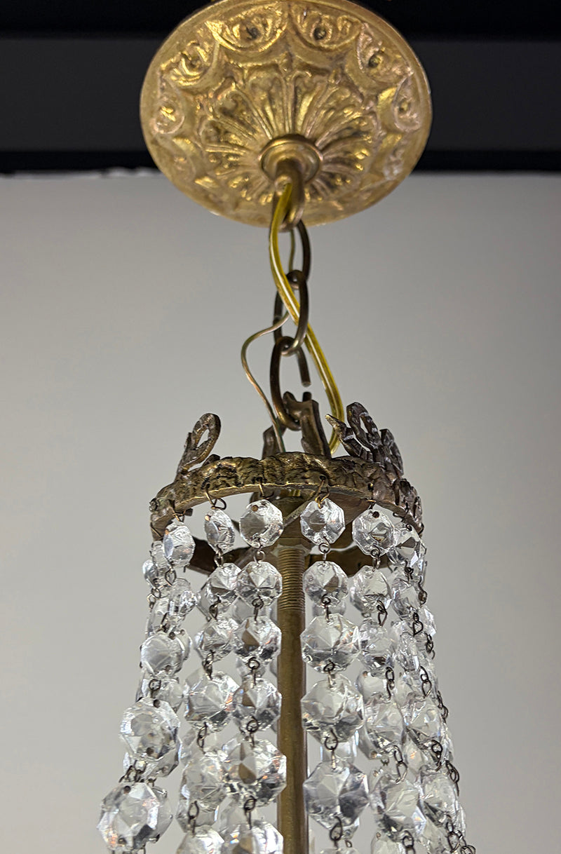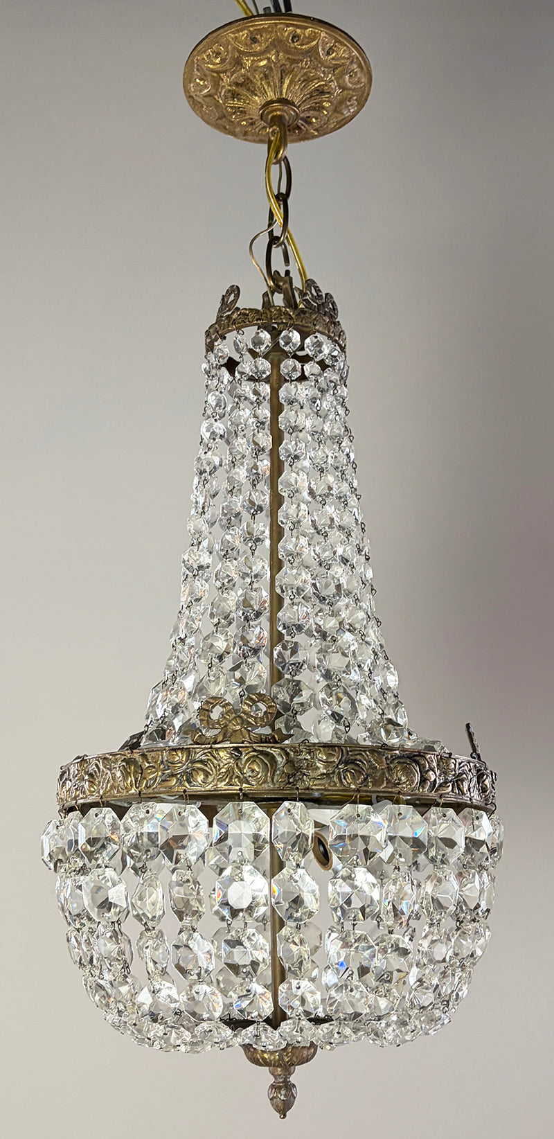 Elegant French crystal empire basket chandelier with cast floral and bow motif. All original, rewired...
