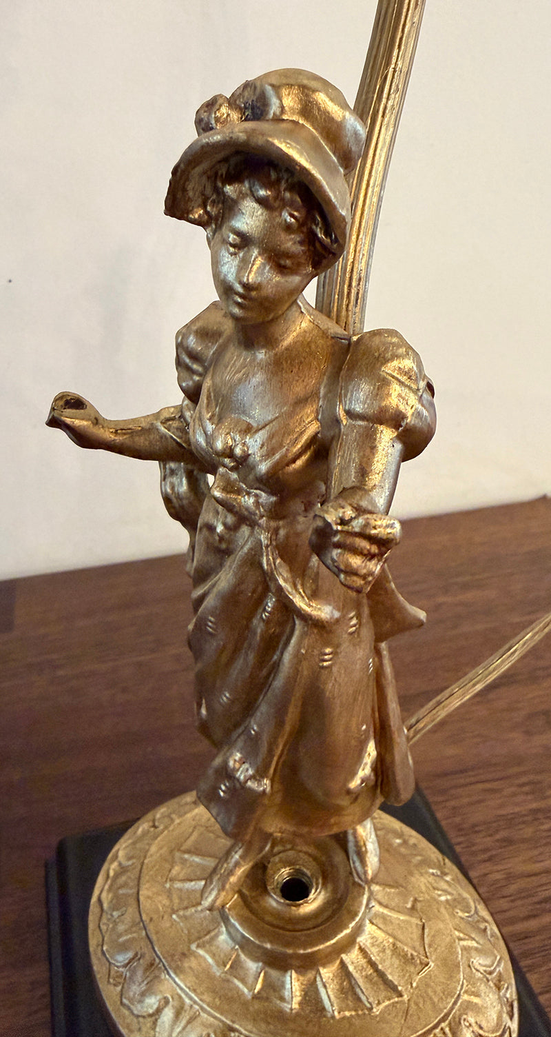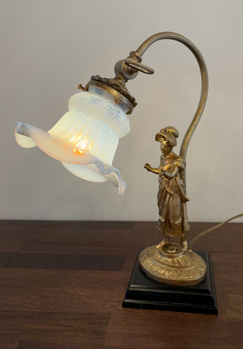 Sweet petite 1920s cast spelter desk lamp with original finish and floral swirl opal shade....