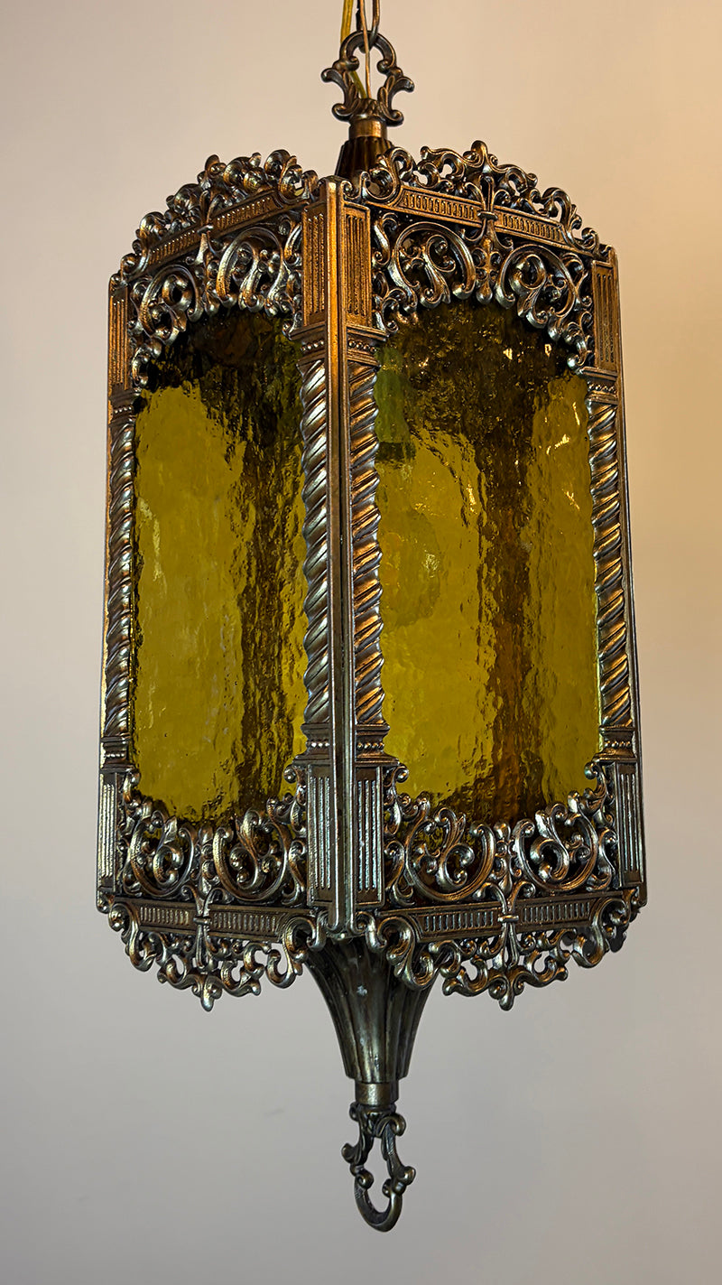 Fun 1970s four sided lantern with original amber glass. Nice ornate detailing on the caset...