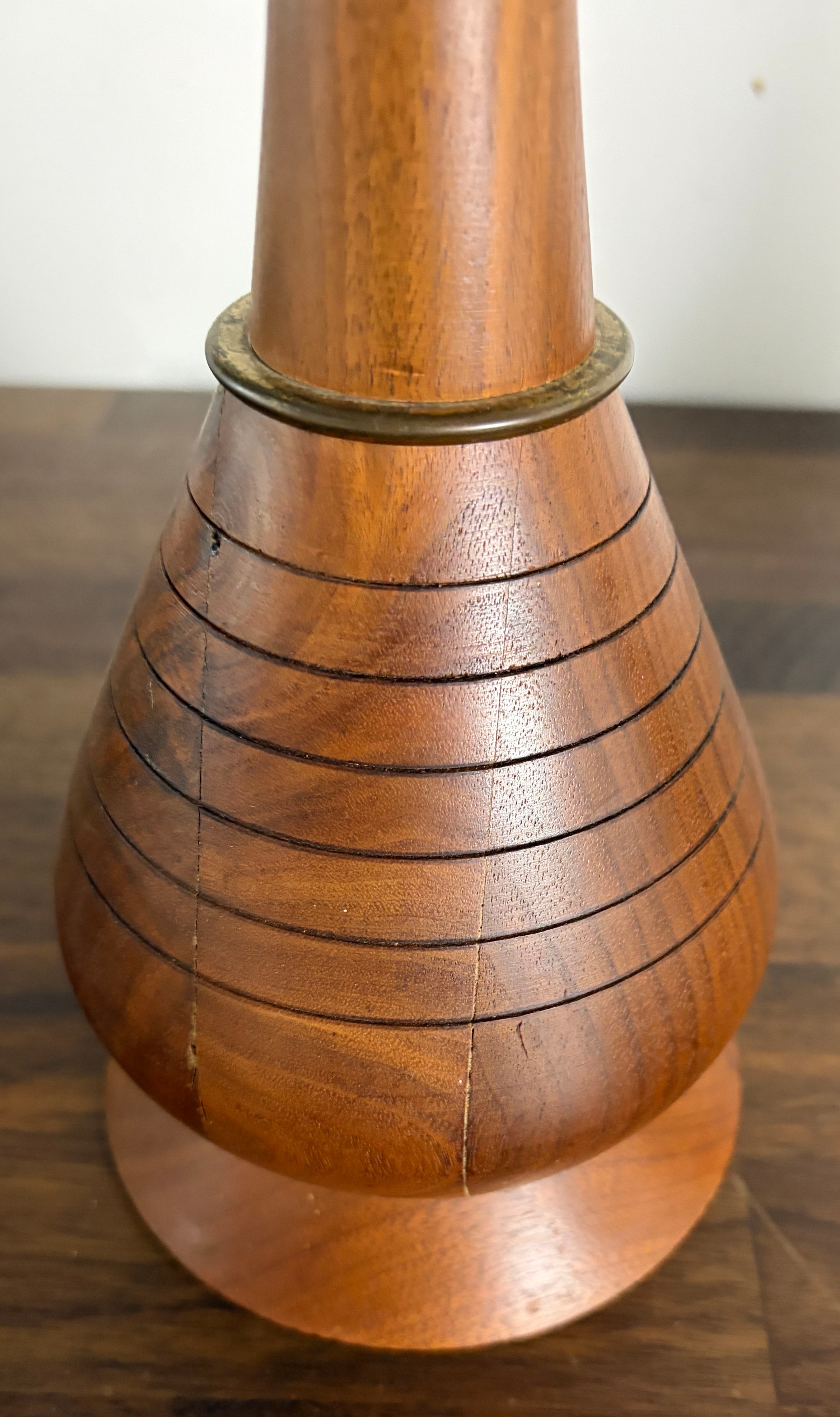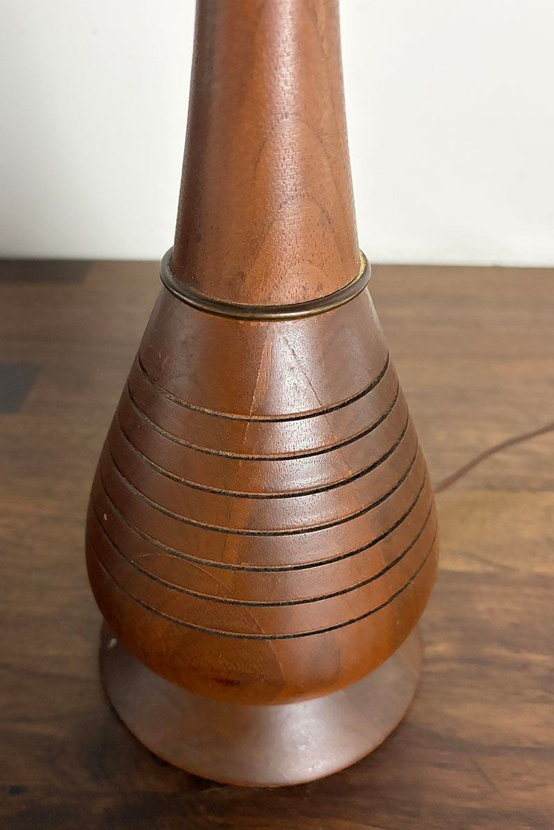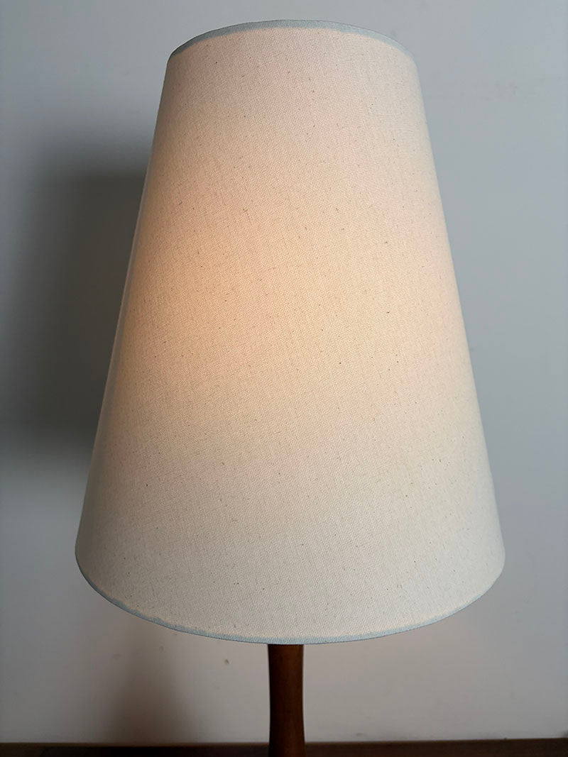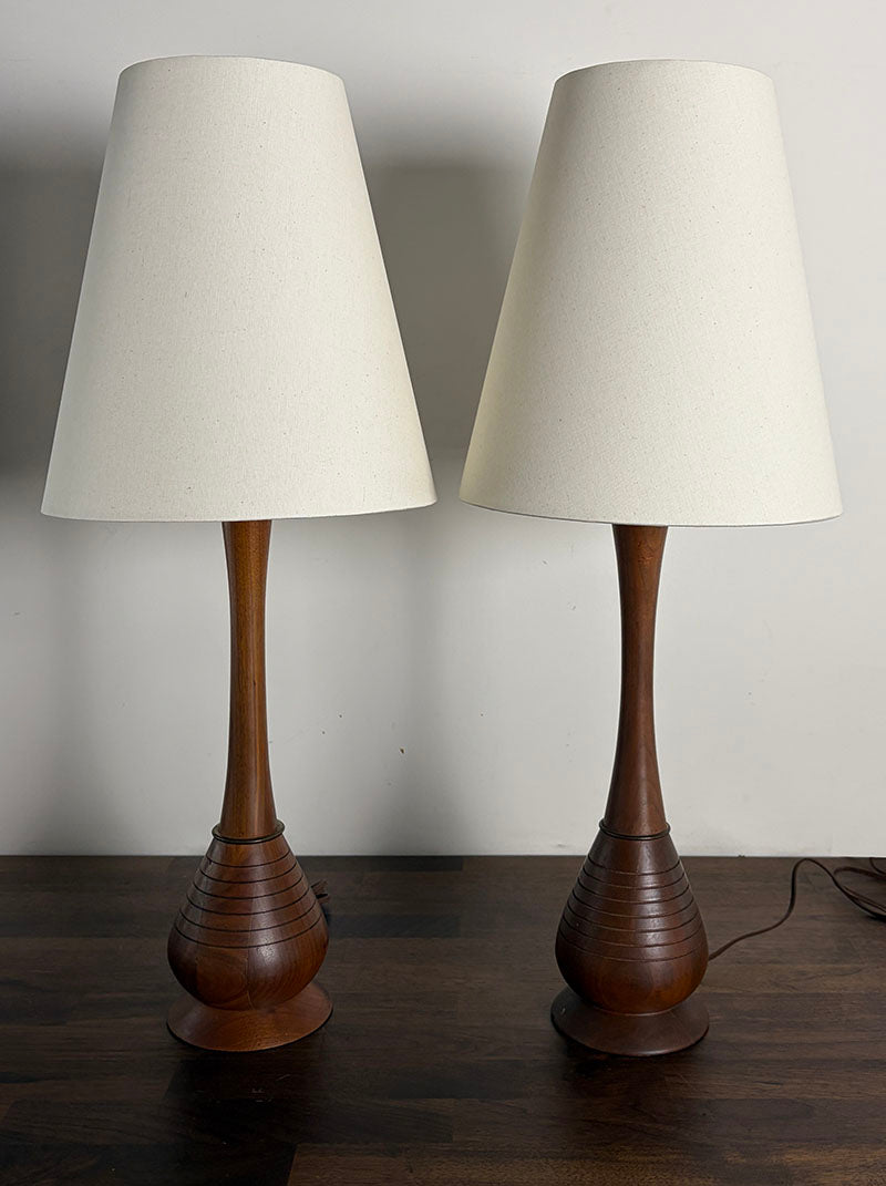 Lovely quality pair or Mid Century wooden table lamps with contemporary handmade linen shades. $950...