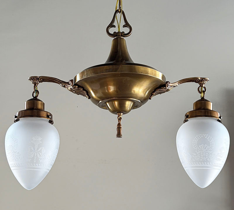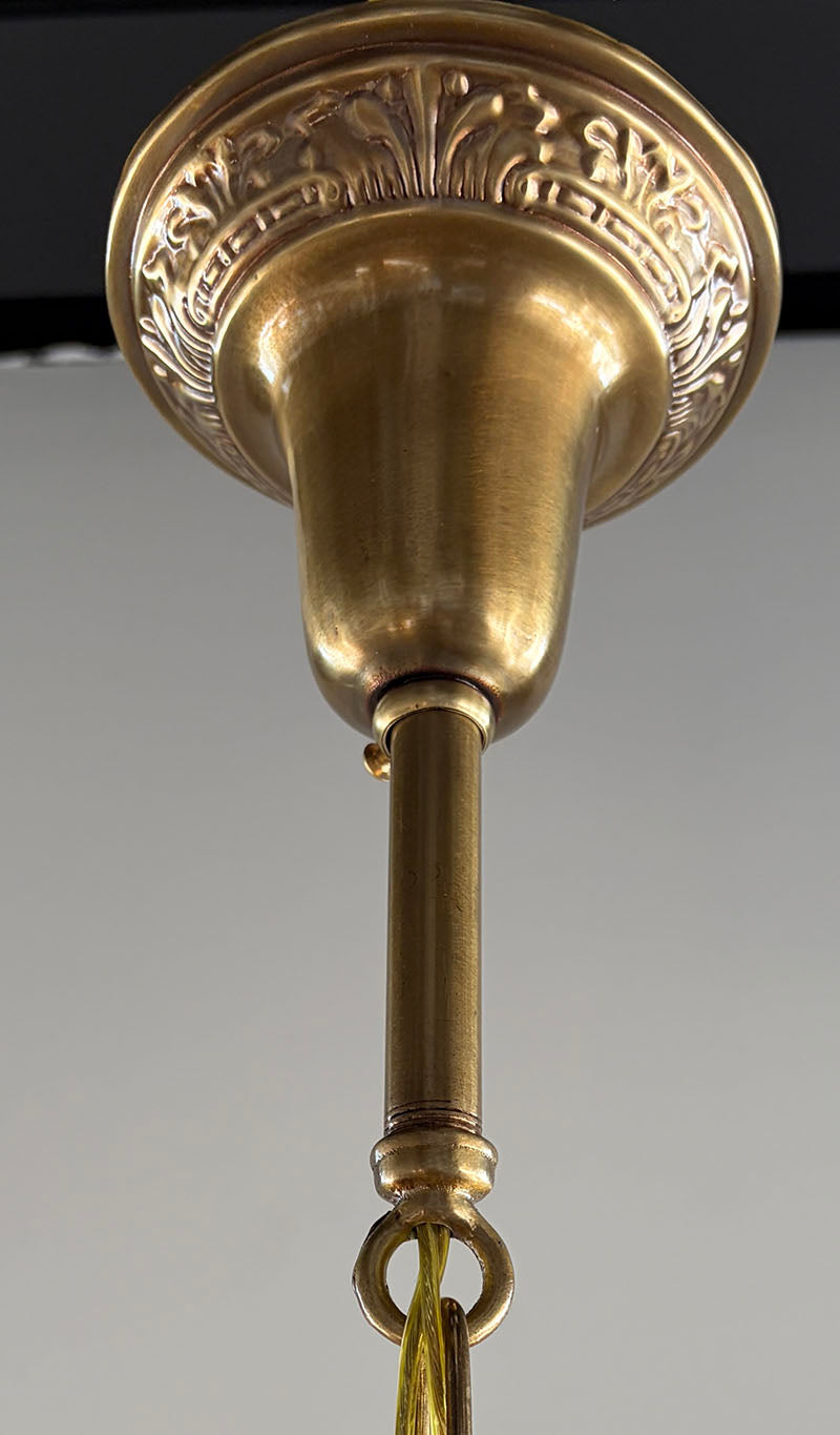 Great character and size on this 1910 era Edwardian pendant. Shade features a detailed garland...