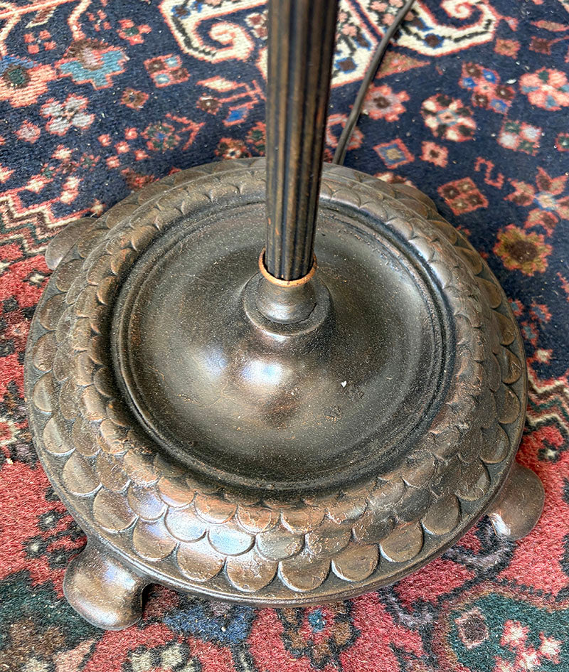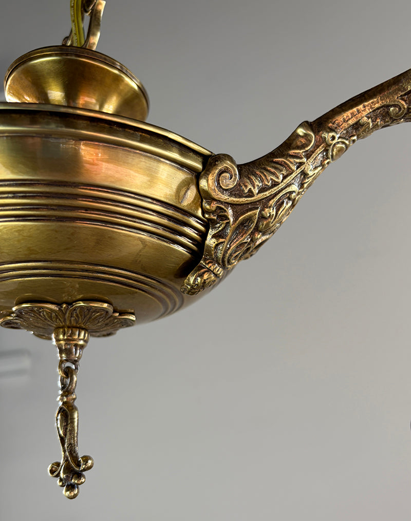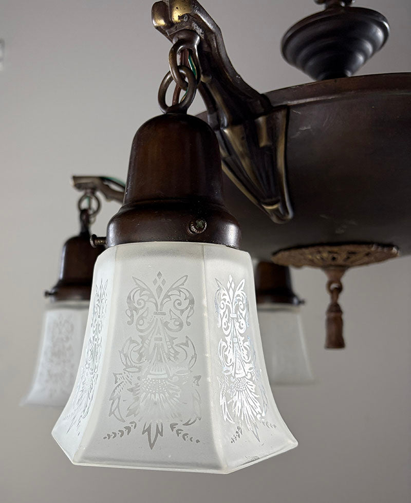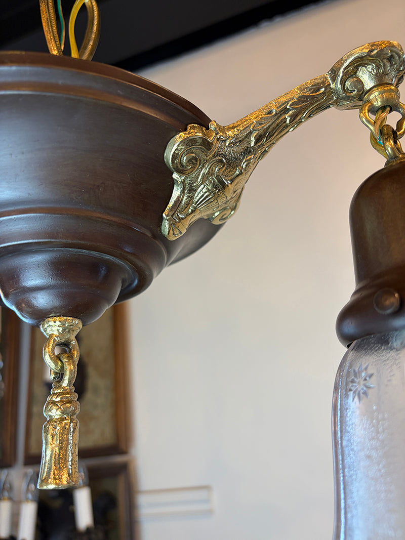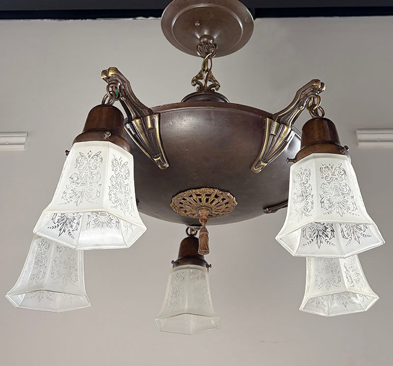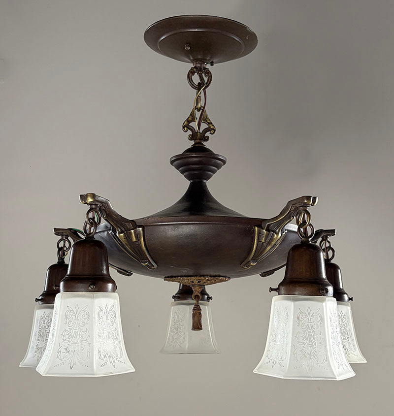 Handsome 1920s Tudor and Art Deco combination five light pan fixture with restored bronze and...