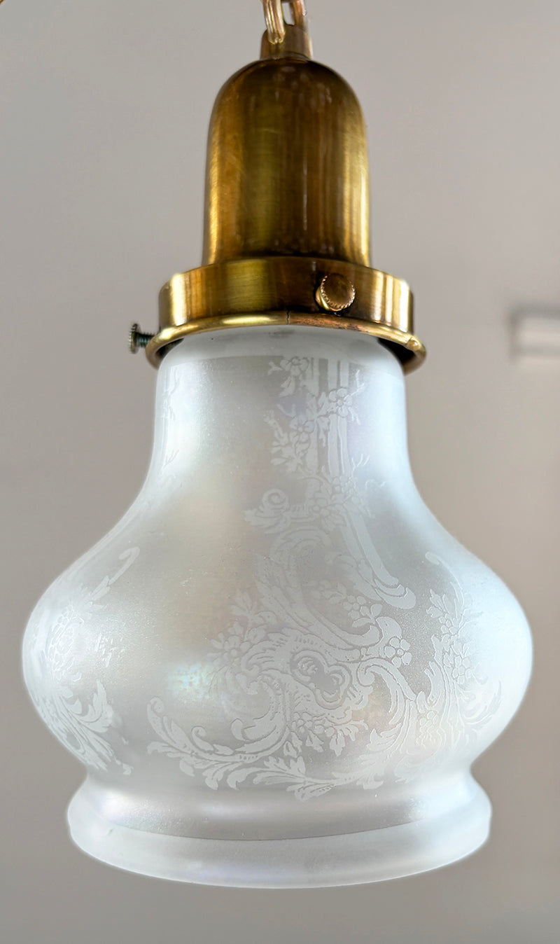 Handsome early 1900s Edwardian four light with embossed Sheffield motif and contemporary frosted fluted shades. ...