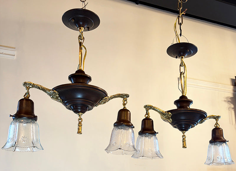 Rare to have a pair of 1920s two light pan fixtures. These have a restored...