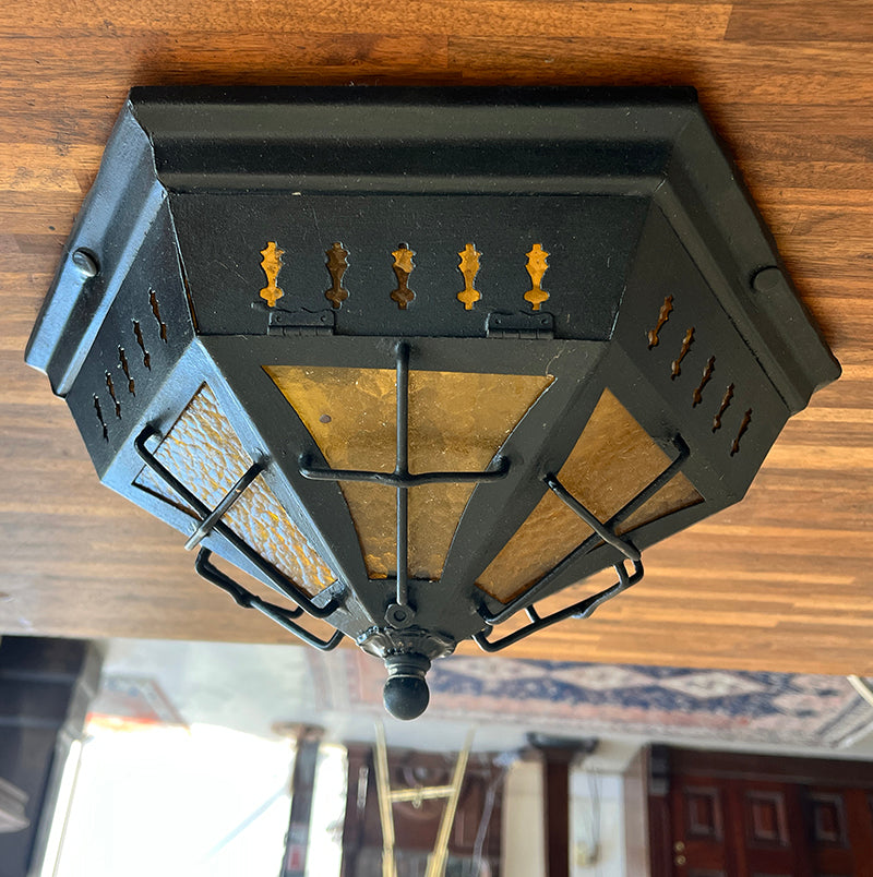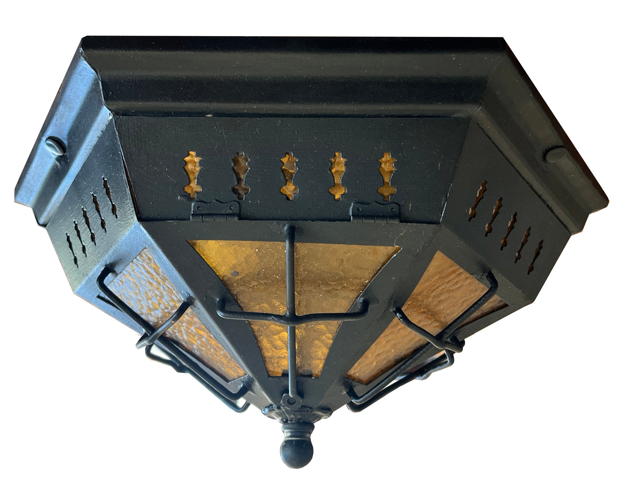Nice storybook 1930s era Arts and Crafts/ Story book style lantern. Original amber glass cylinder...