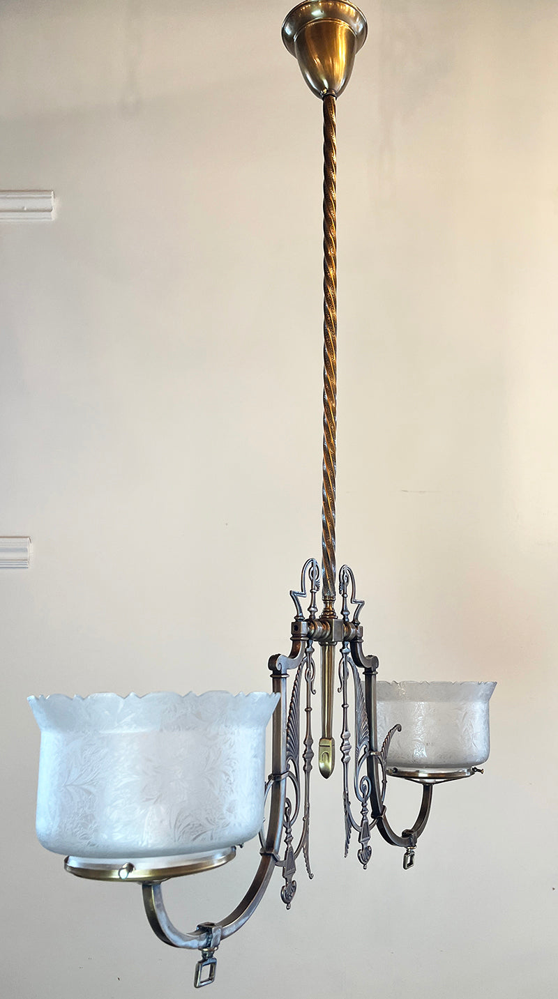 This transitional Art Nouveau Edwardian converted gas two light fixture has great scale at 36"...